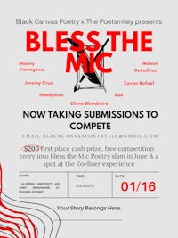 Come out to Black Canvas Poetry's First event of 2026! Doors open at 6:30. Three new features, three new voices, three new stories!